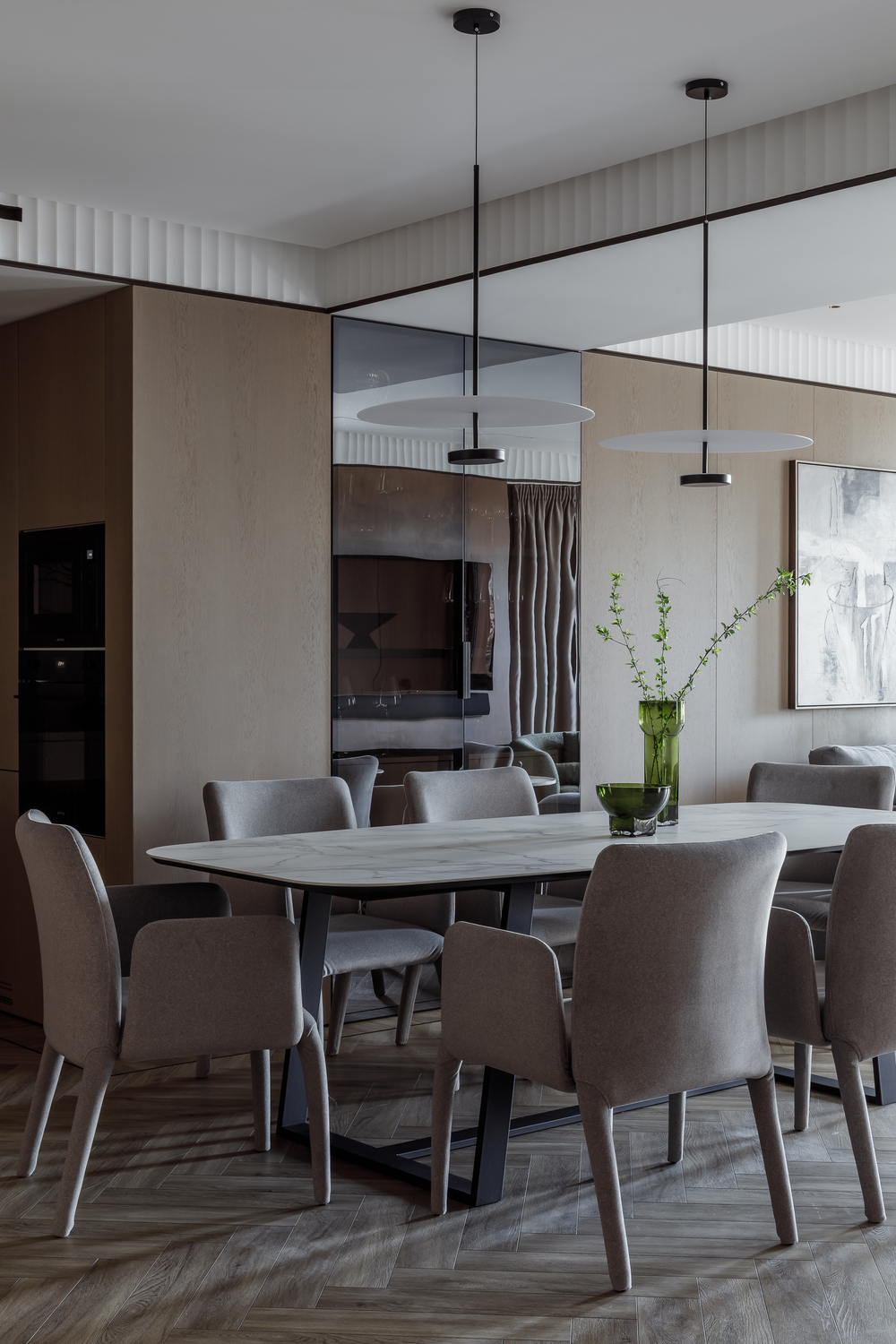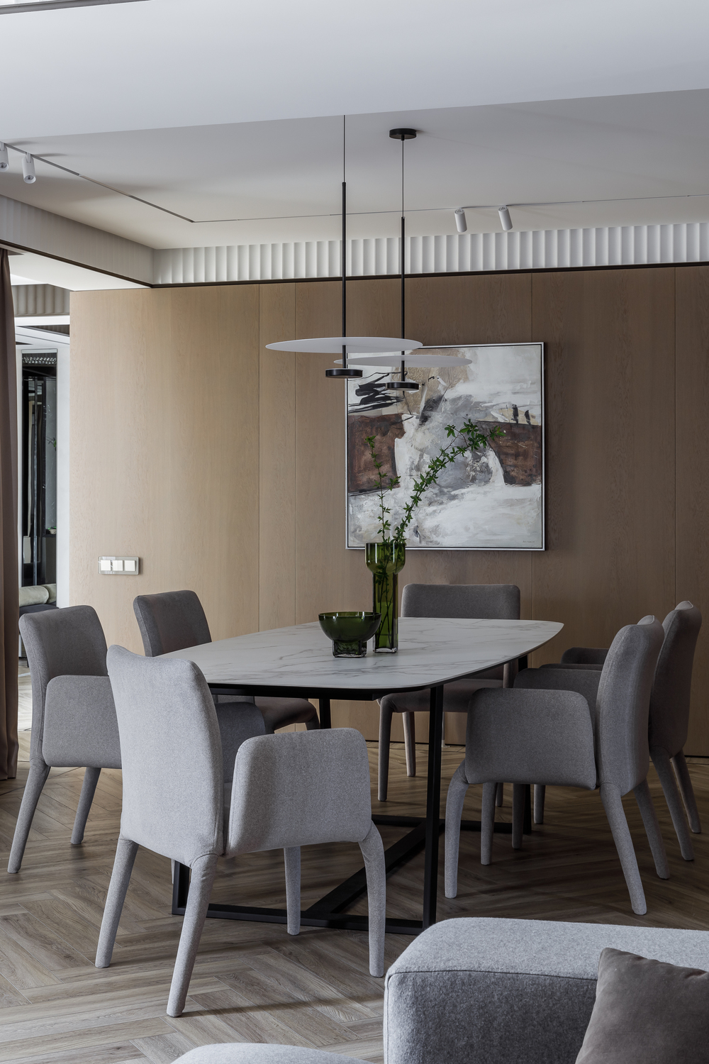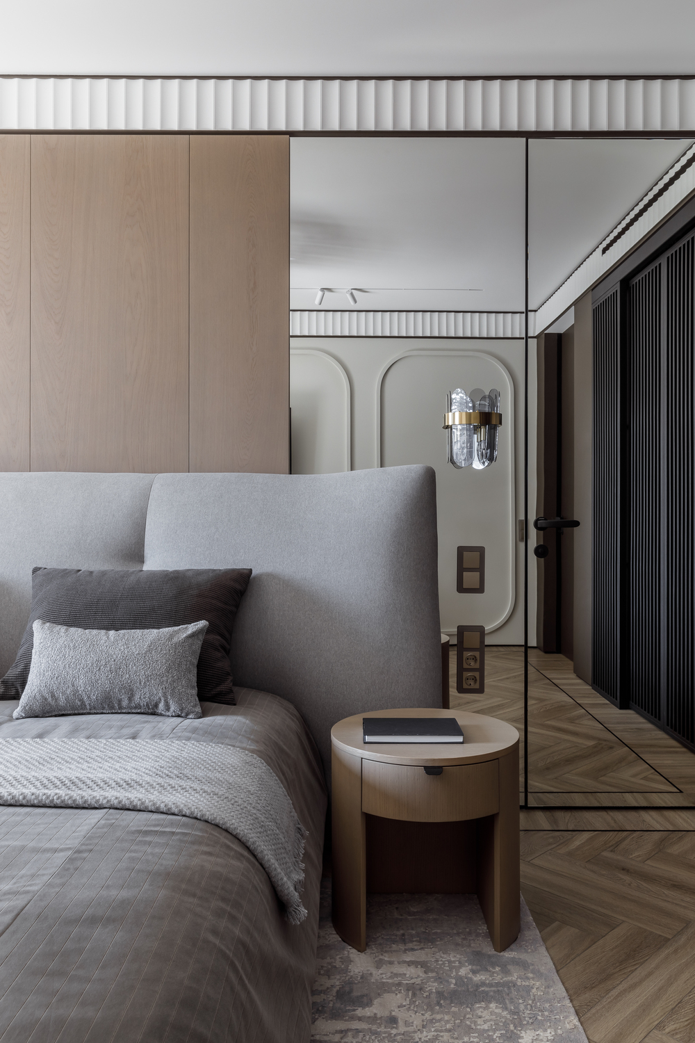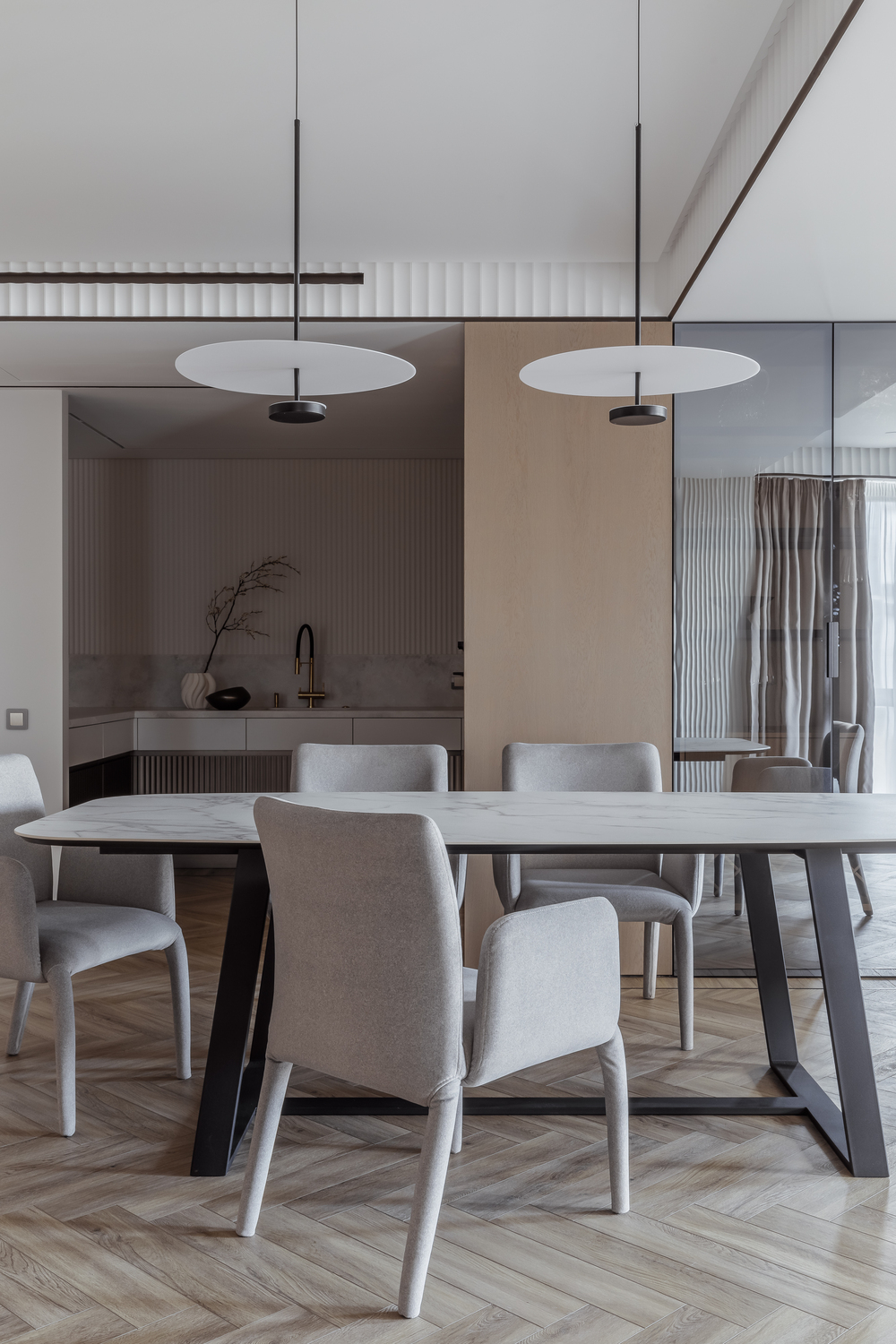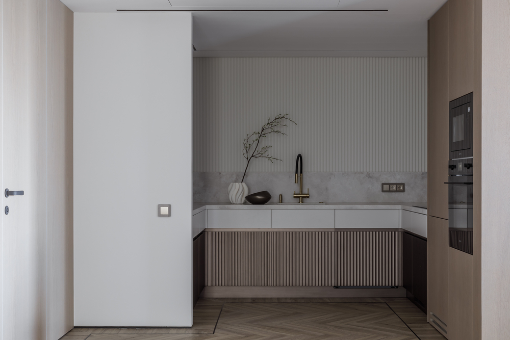 - 🪵 шпонированные панели в высоту ригелей — маскируют пеналы кухни и часть дверей, создают камерность и объединяют пространства;