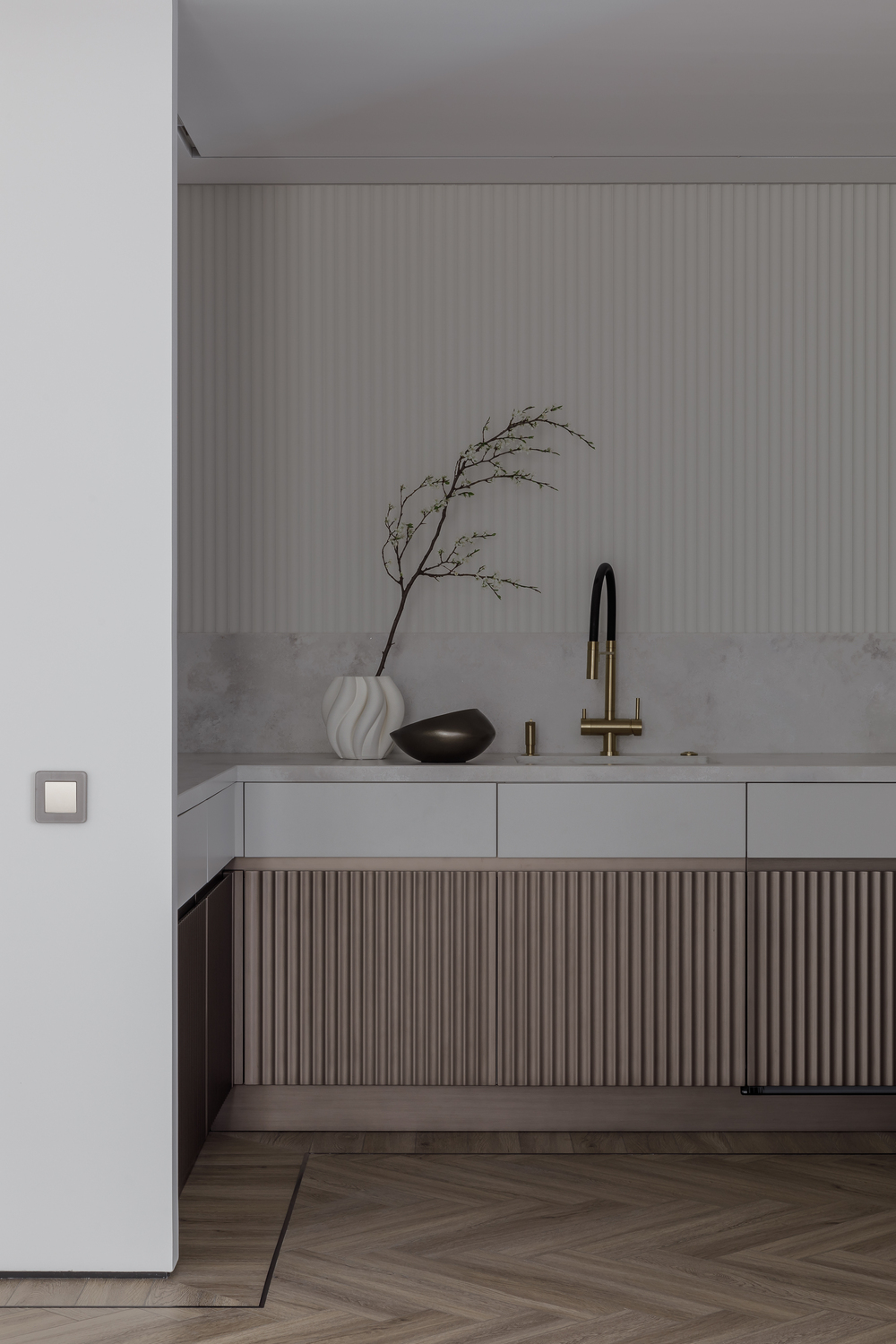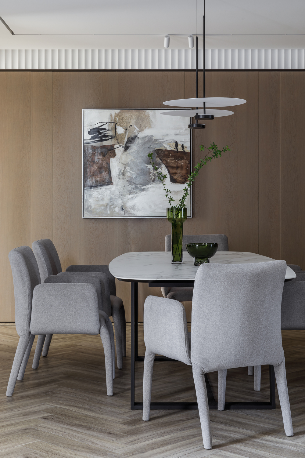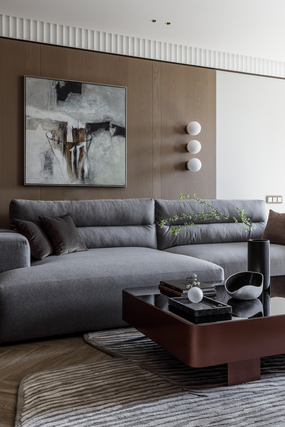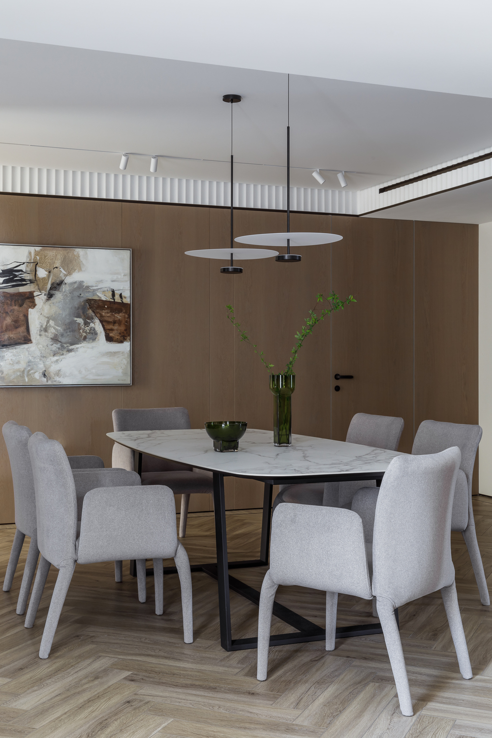 - 🪵 шпонированные панели в высоту ригелей — маскируют пеналы кухни и часть дверей, создают камерность и объединяют пространства;