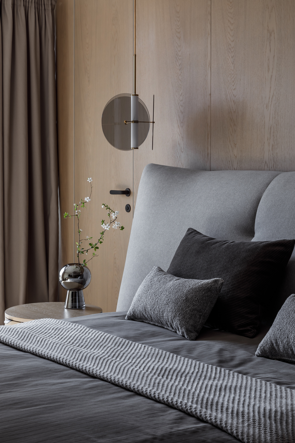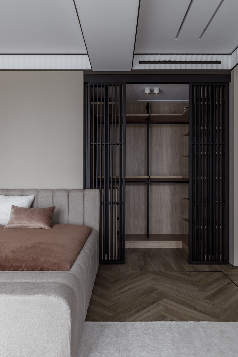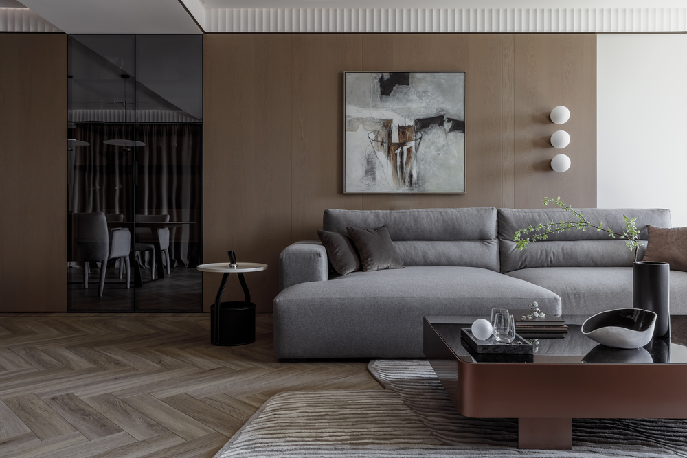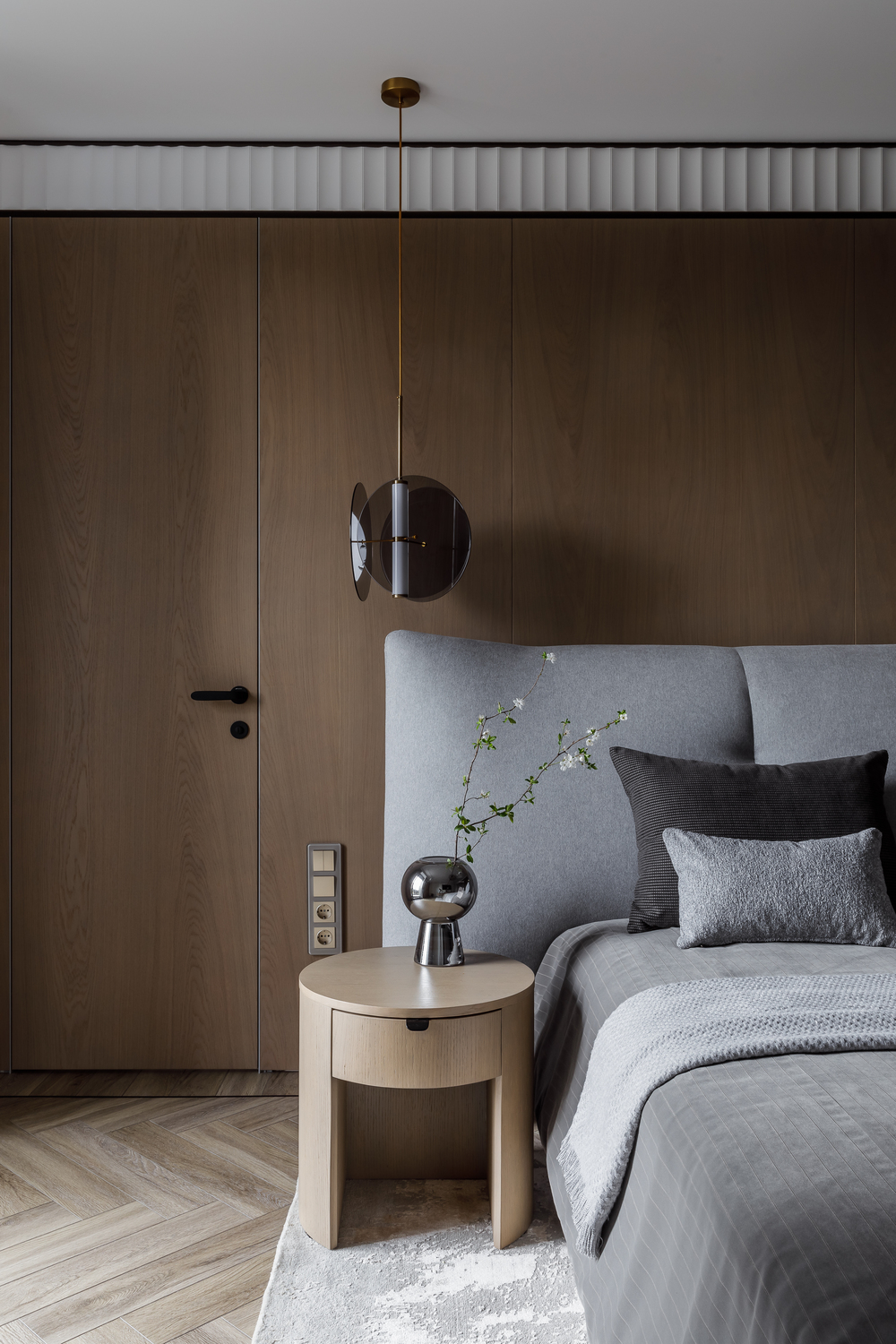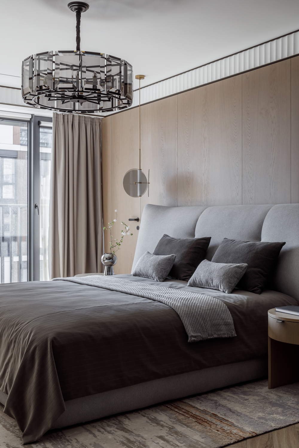 - 🪵 шпонированные панели в высоту ригелей — маскируют пеналы кухни и часть дверей, создают камерность и объединяют пространства;