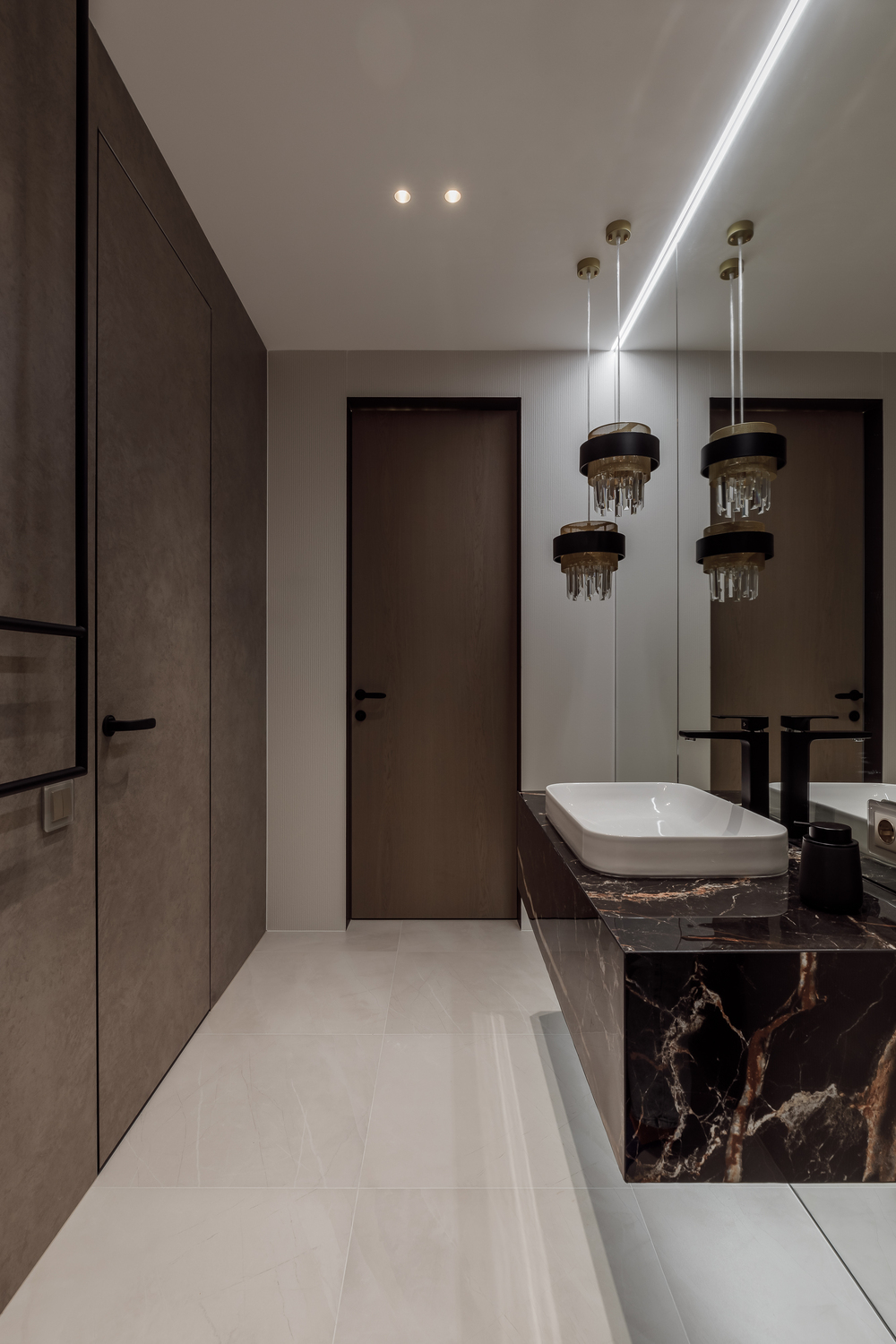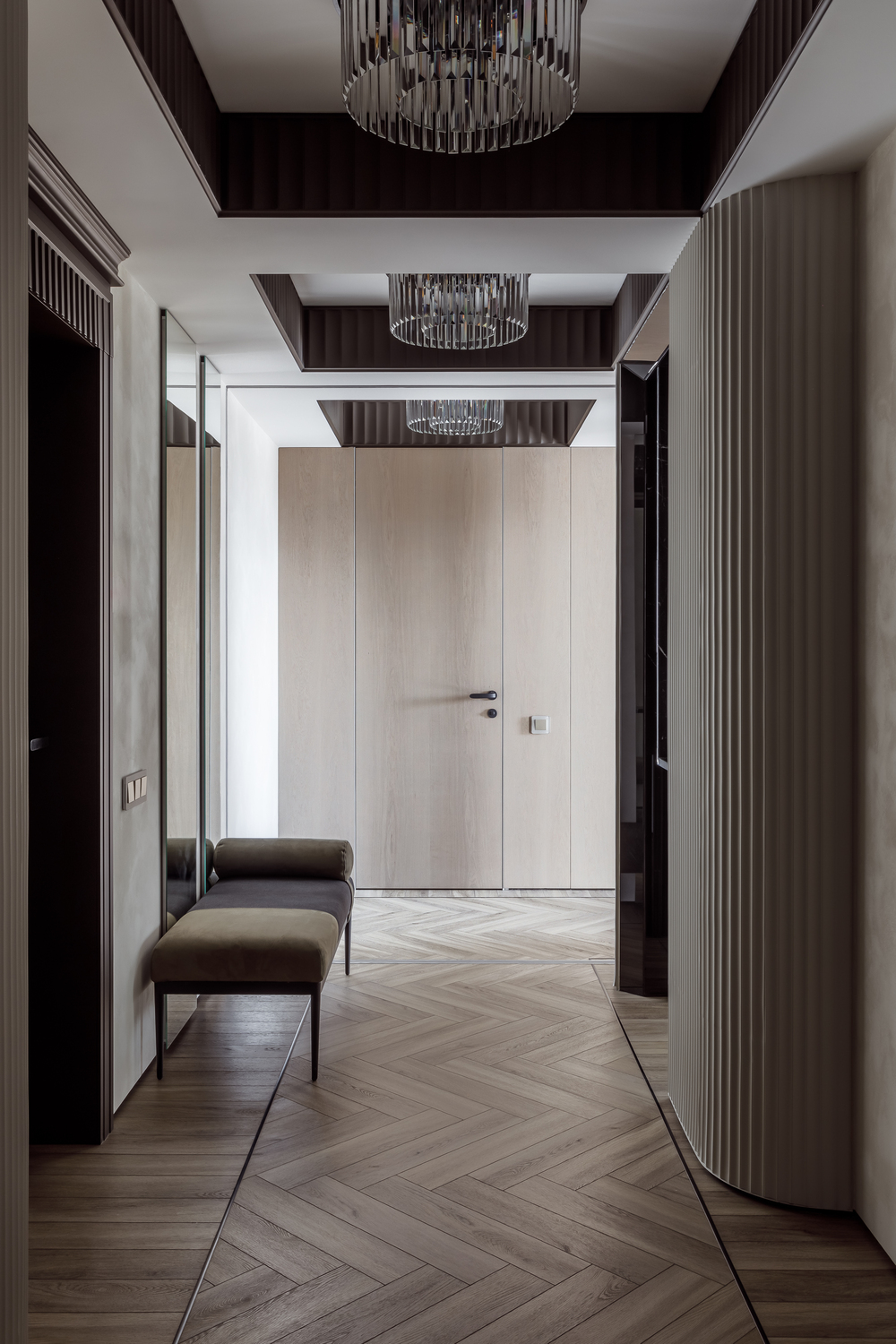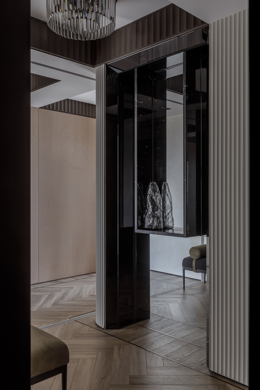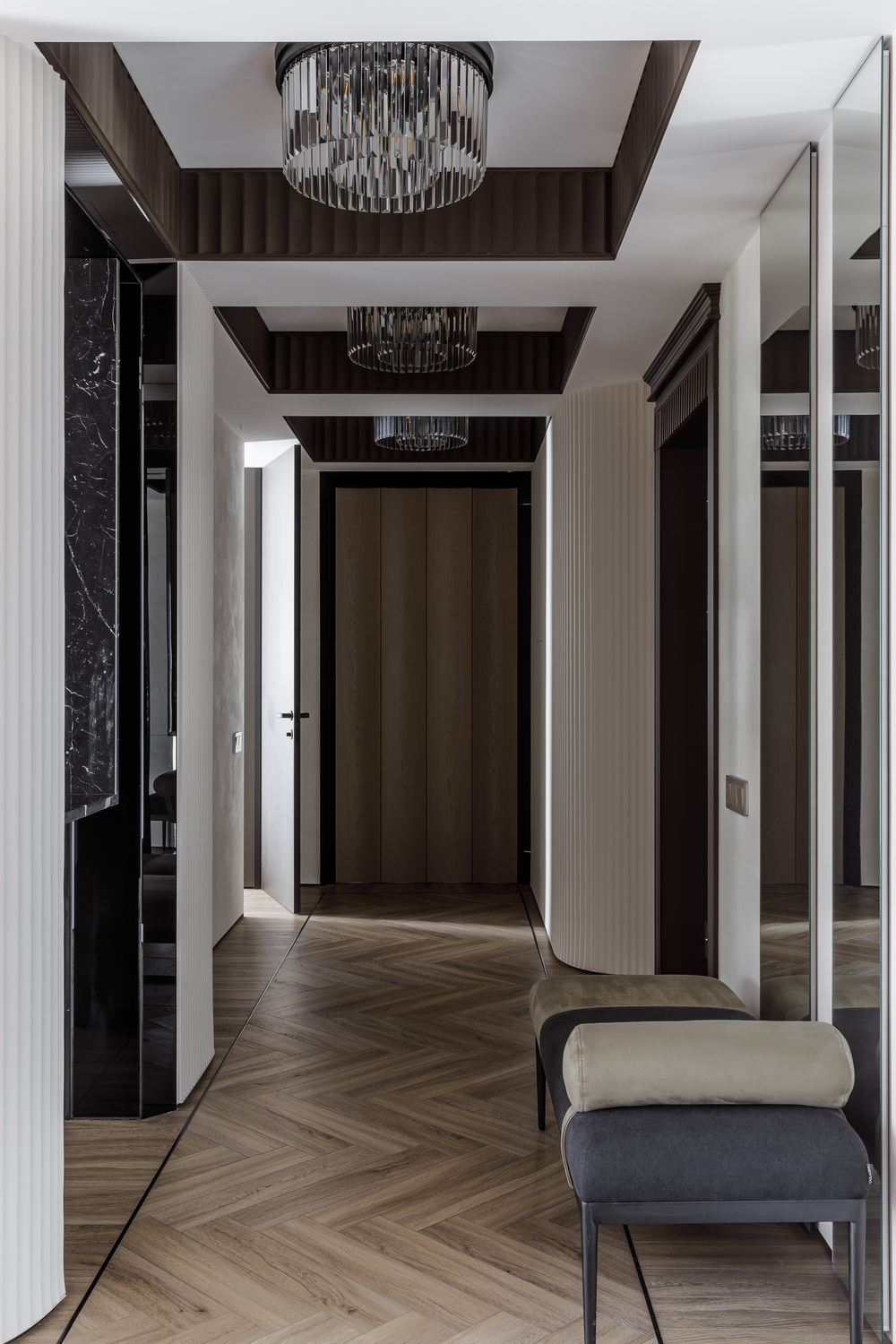 - ✨ декоративные порталы в прихожей — скос под 45∘ из чёрного стекла с подсветкой, зеркала, подвесные консоли из мрамора и шпонированные панели с радиальными загибами;