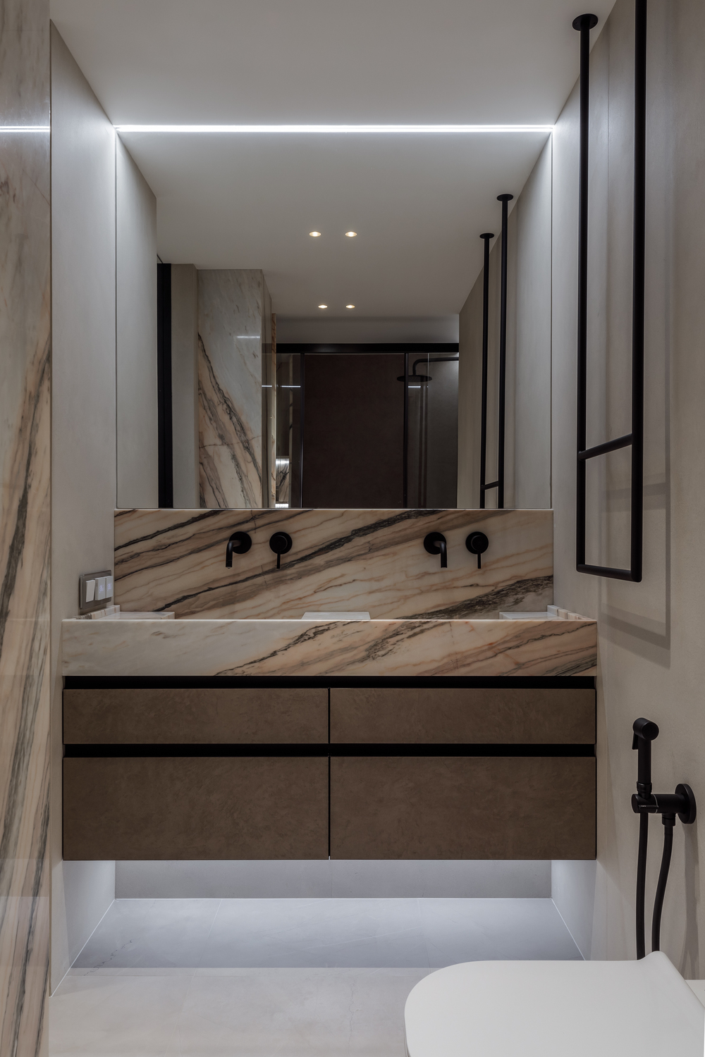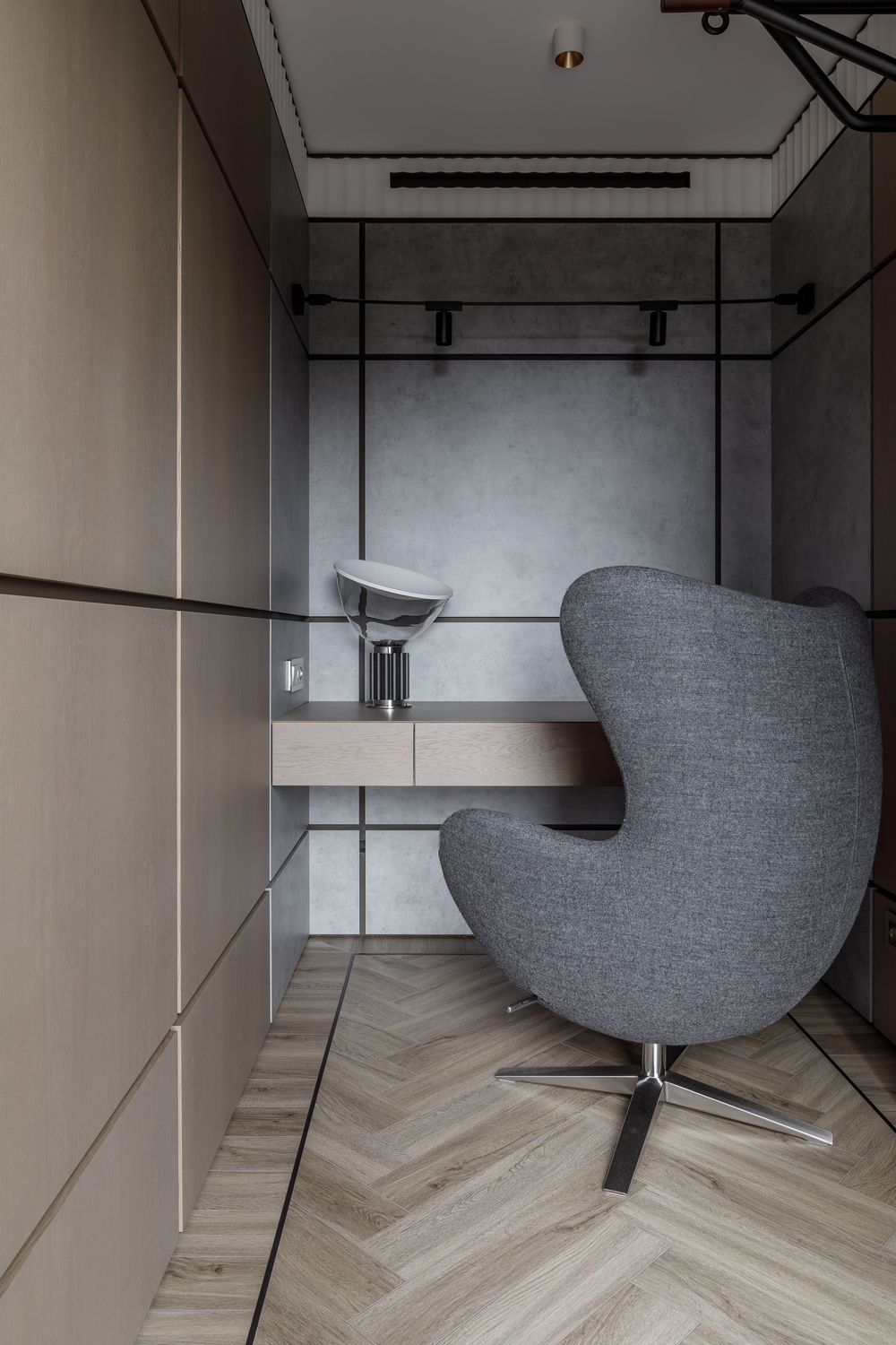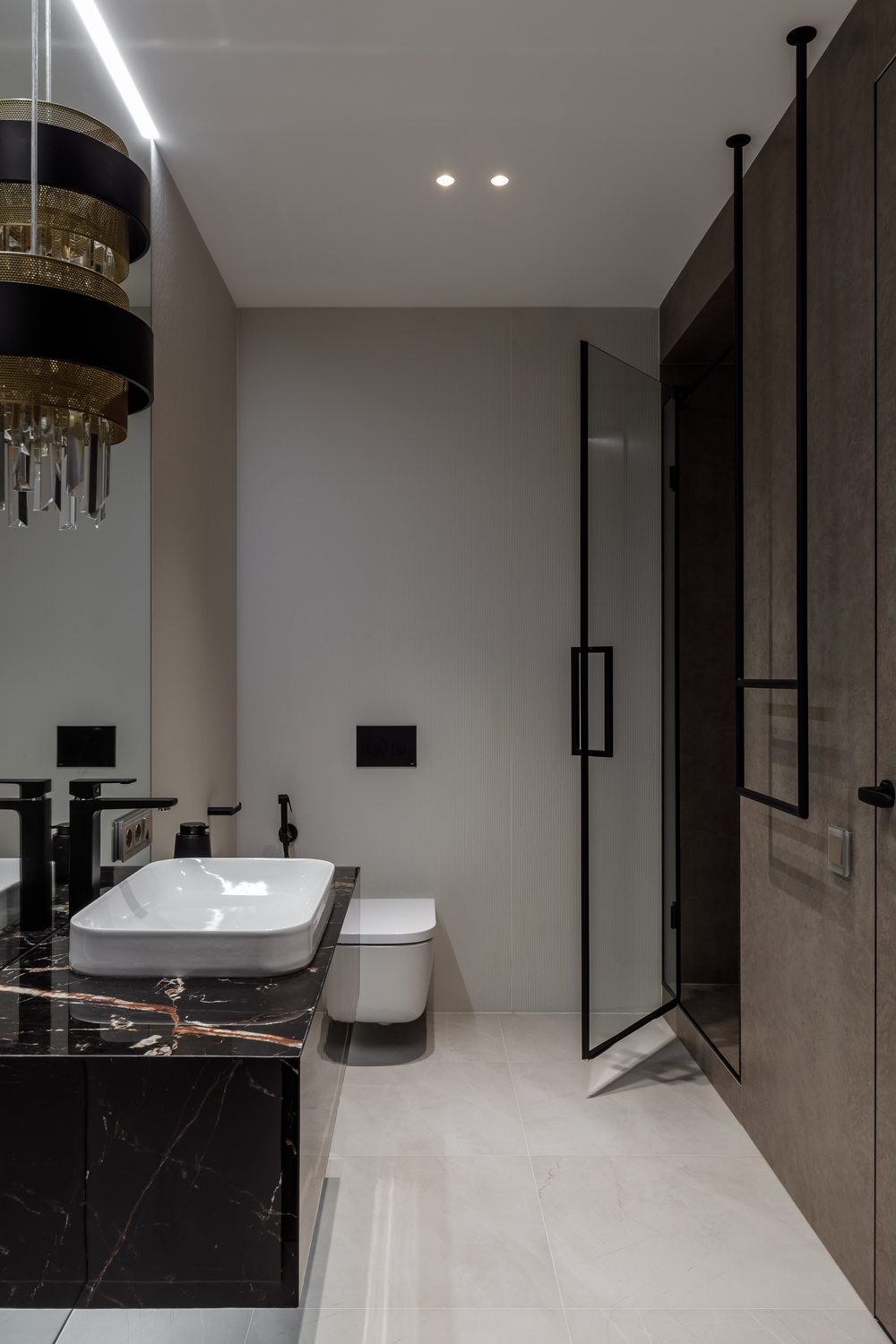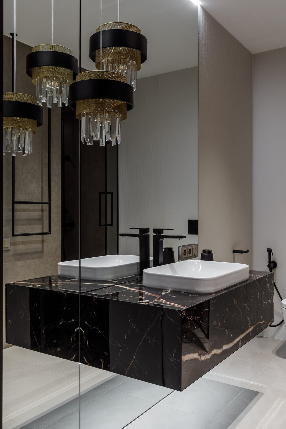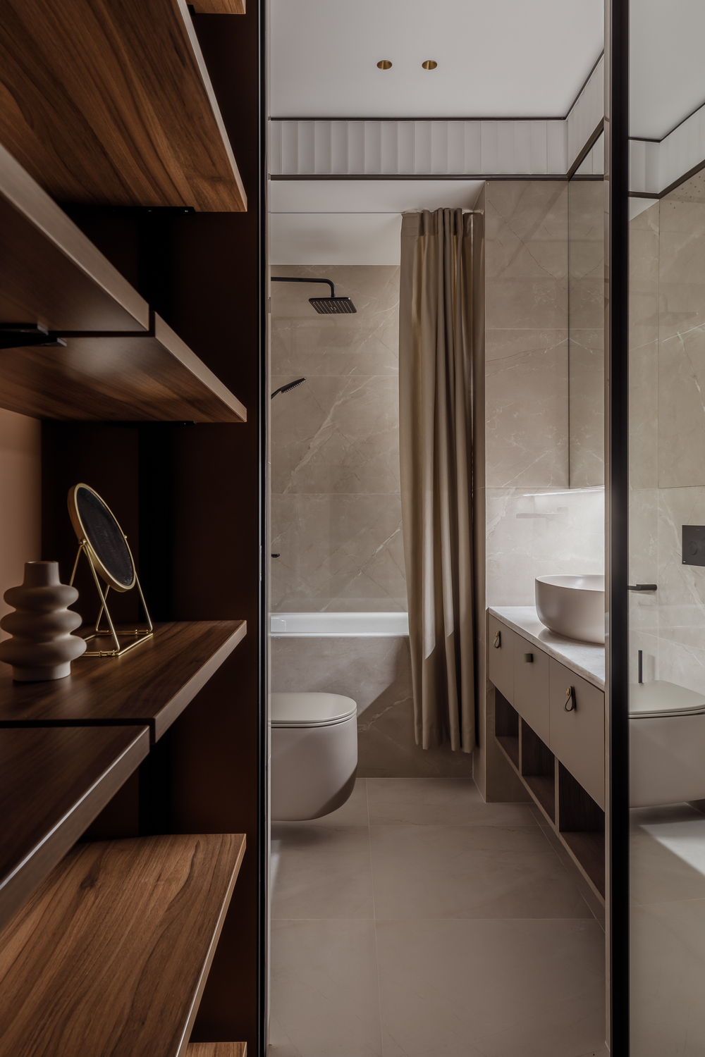 - ✨ декоративные порталы в прихожей — скос под 45∘ из чёрного стекла с подсветкой, зеркала, подвесные консоли из мрамора и шпонированные панели с радиальными загибами;