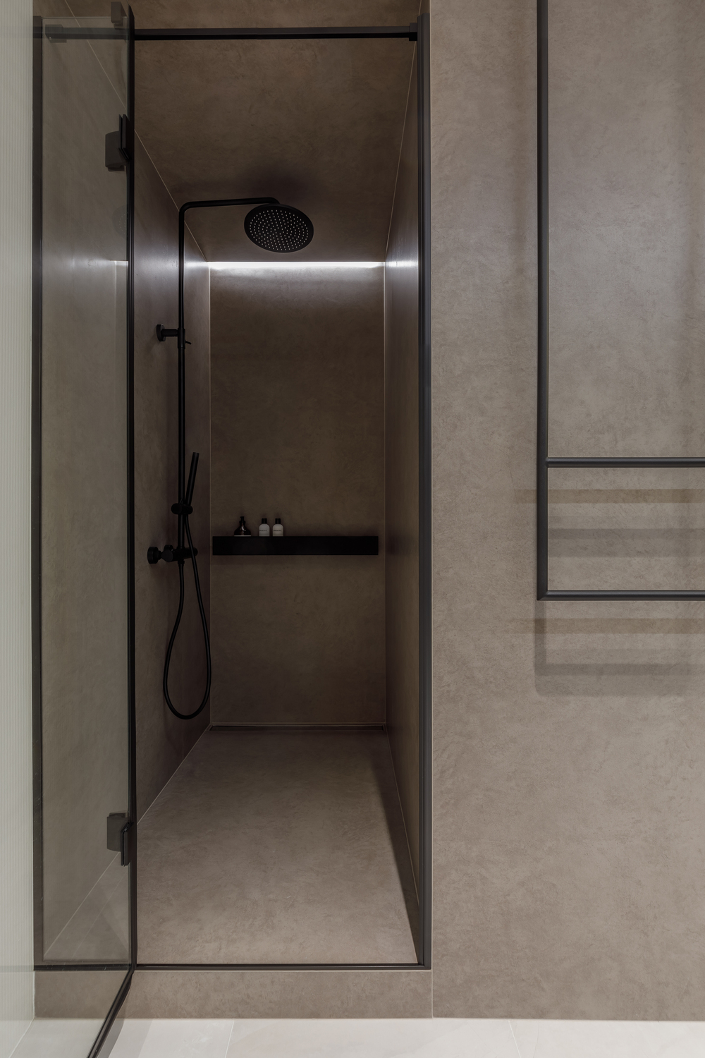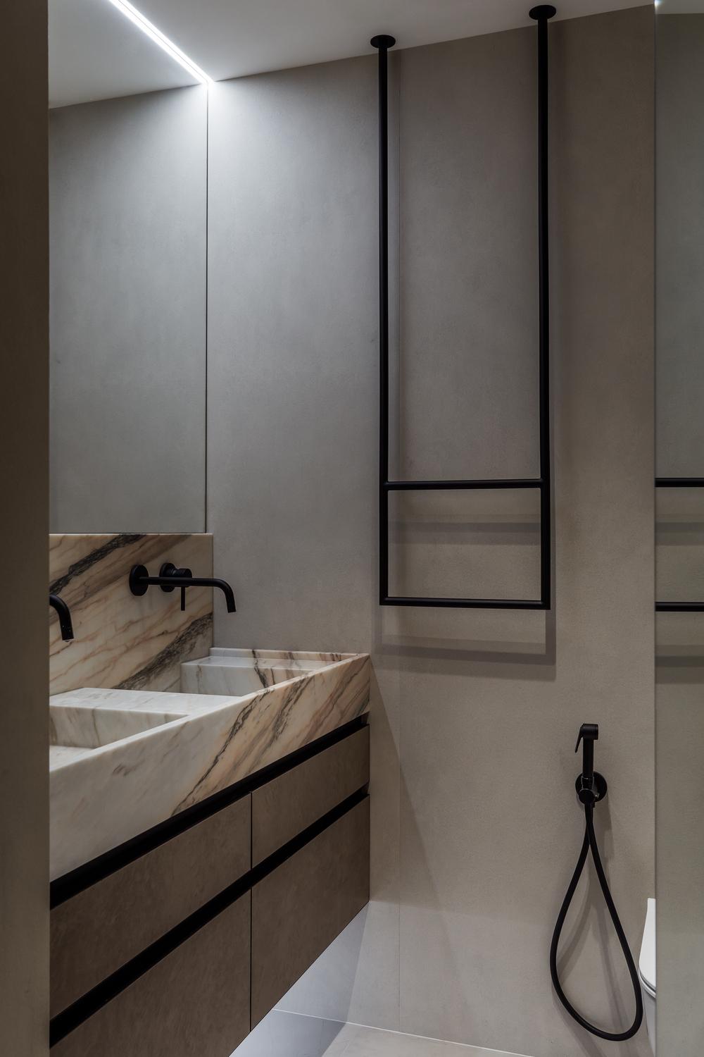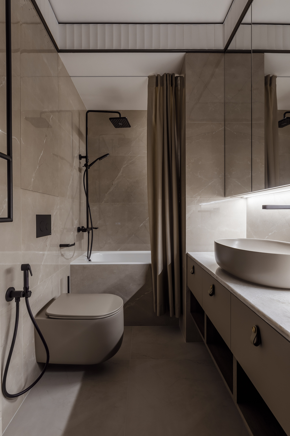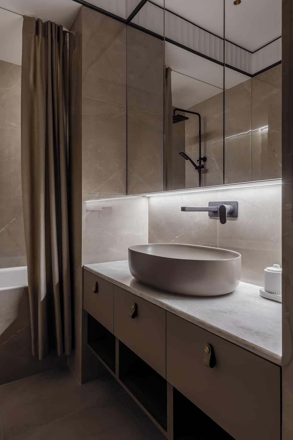 - ✨ декоративные порталы в прихожей — скос под 45∘ из чёрного стекла с подсветкой, зеркала, подвесные консоли из мрамора и шпонированные панели с радиальными загибами;